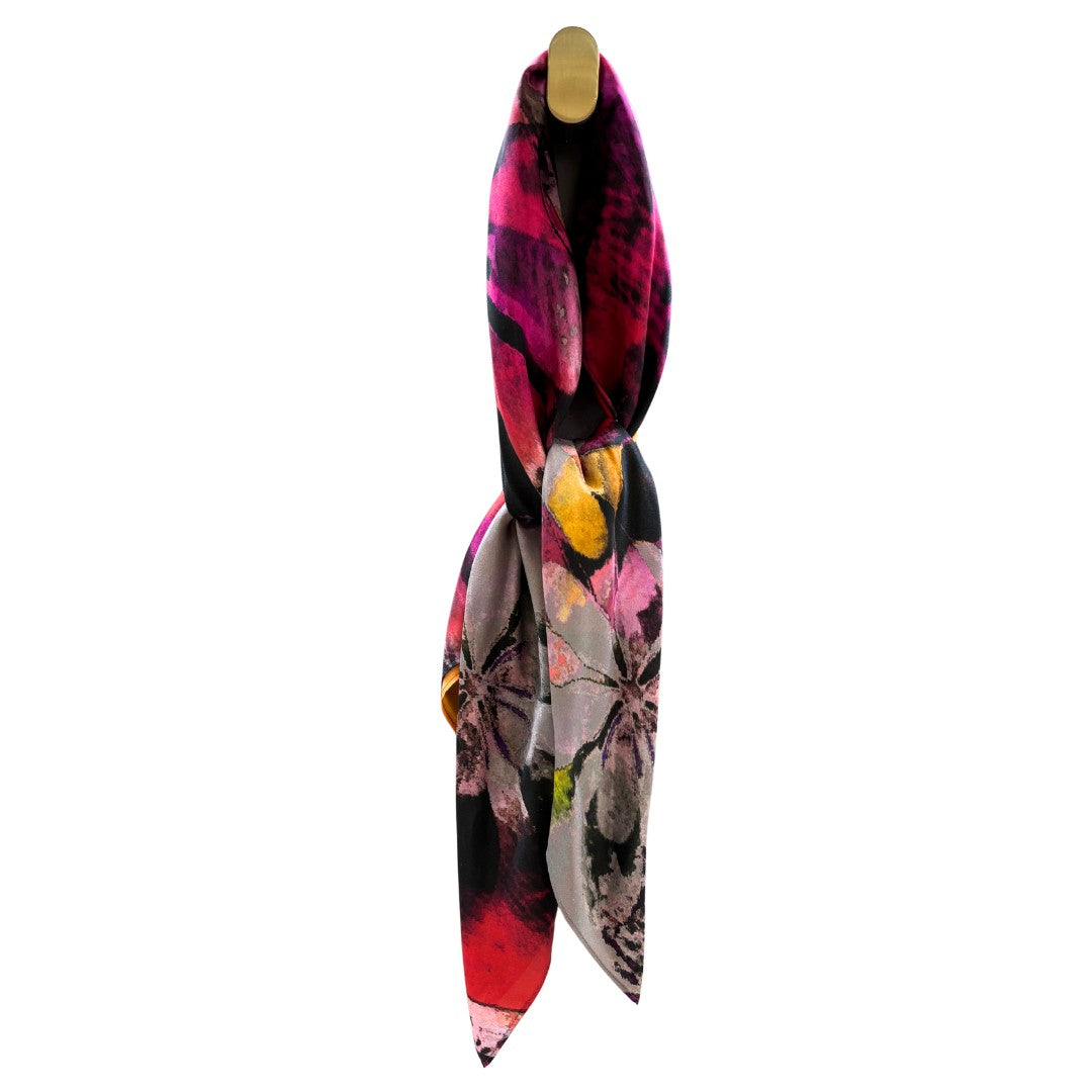 A digital print mulberry habotai silk square scarf which is a chic and elegant accessory to complement this season’s look. Each scarf is finished off with a machine stitched hem. Silk sourced, printed and handmade in the UK.